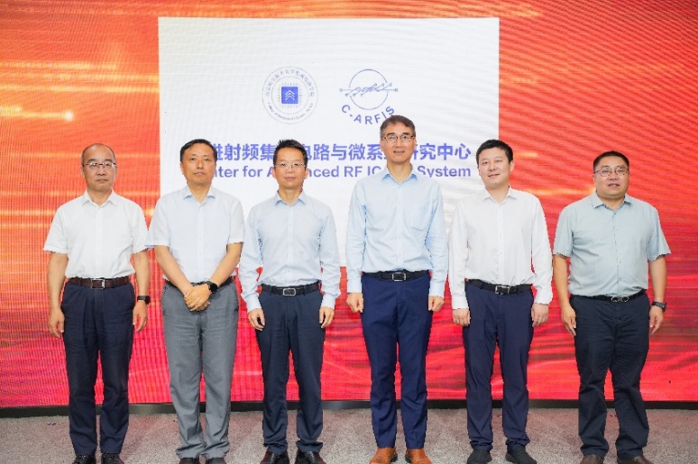 刘宇雷、郭永新、纪忠、李韬、潘益明和动漫花园 党委书记黄彬共同为先进射频集成电路与微系统研究中心揭牌。此次揭牌标志着研究中心建设迈入新阶段,中心将立足国家需求,聚焦核心技术,全面提升自主创新和成果转化能力。
