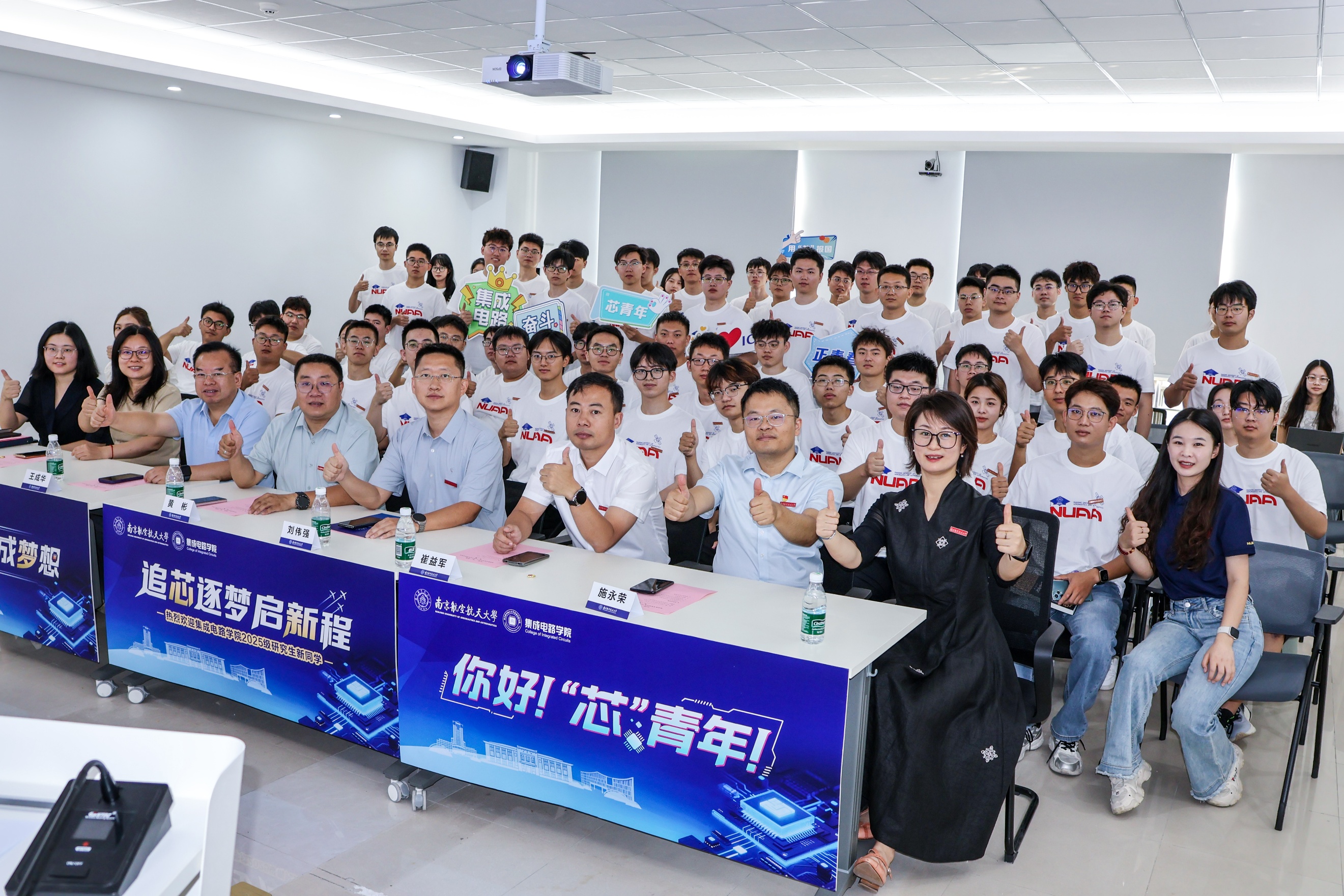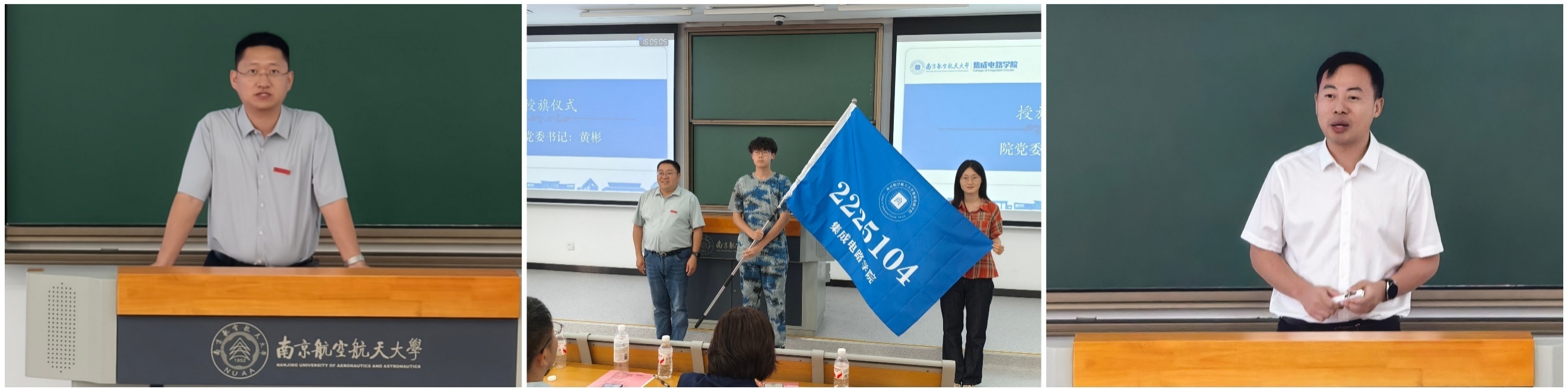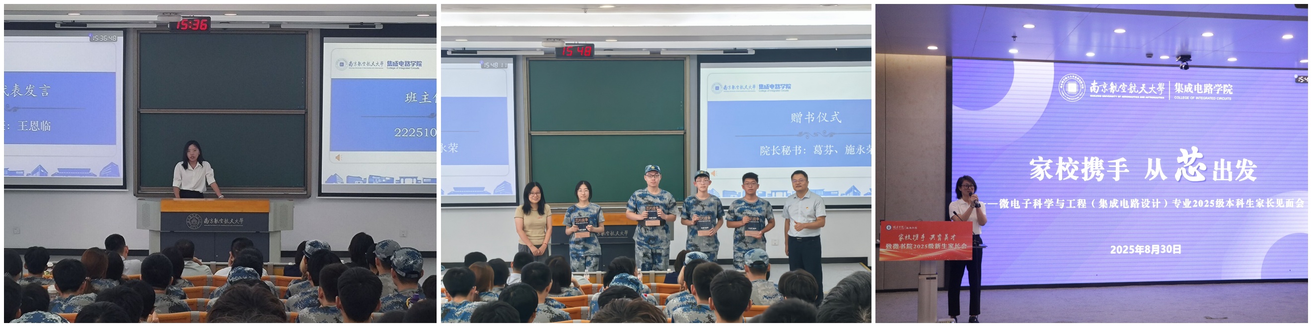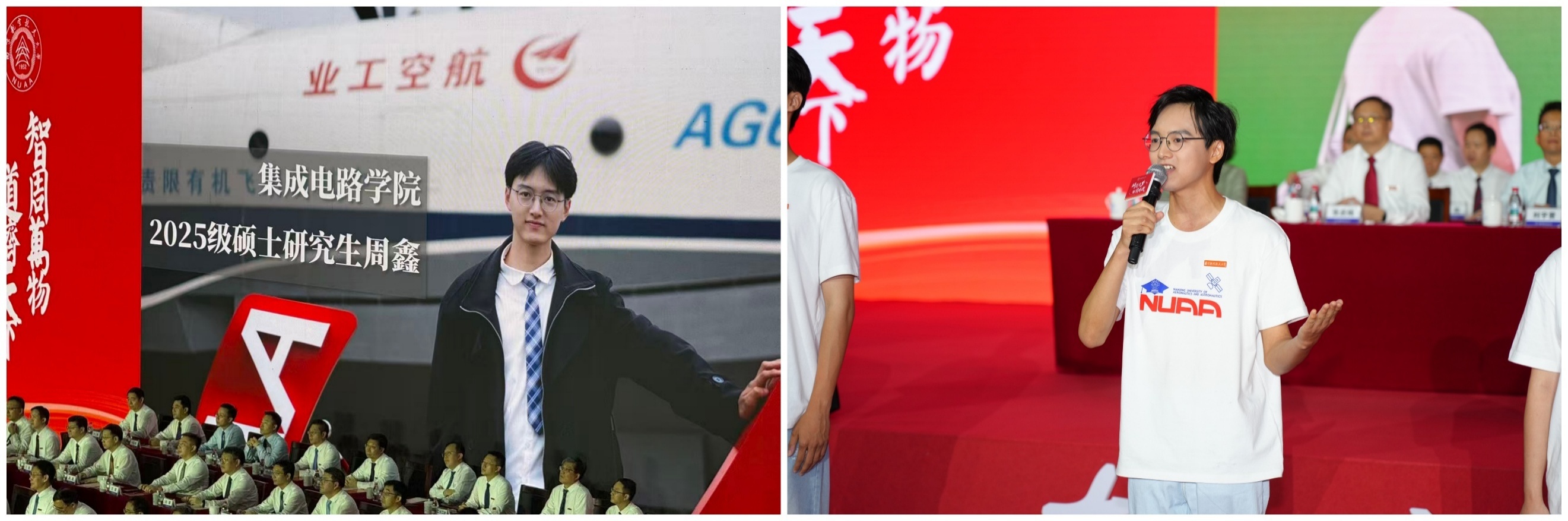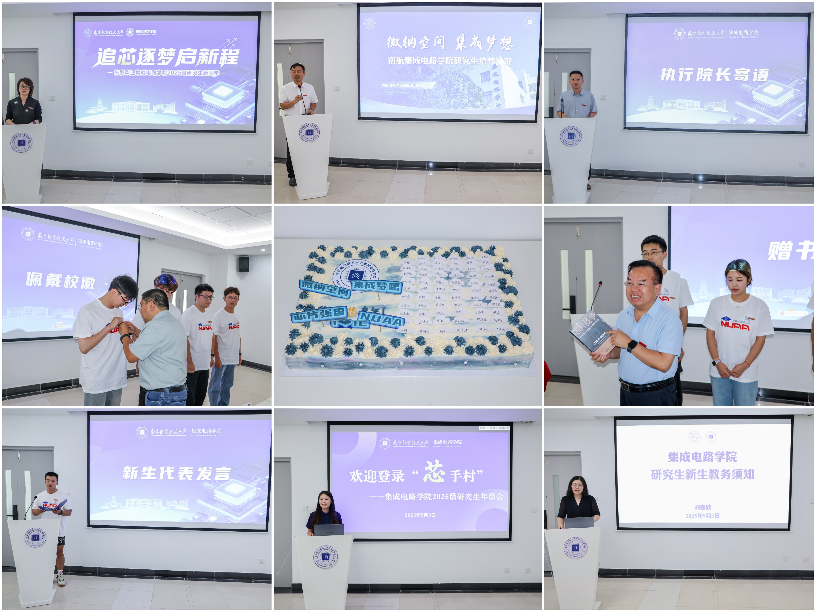在学校2025级新生开学典礼上,动漫花园 研究生学生代表周鑫上台发言,展现集成电路学子的思考与风采。张正、王子杰同学作为新生代表上台佩戴校徽,新一代南航“芯”青年正式启航。