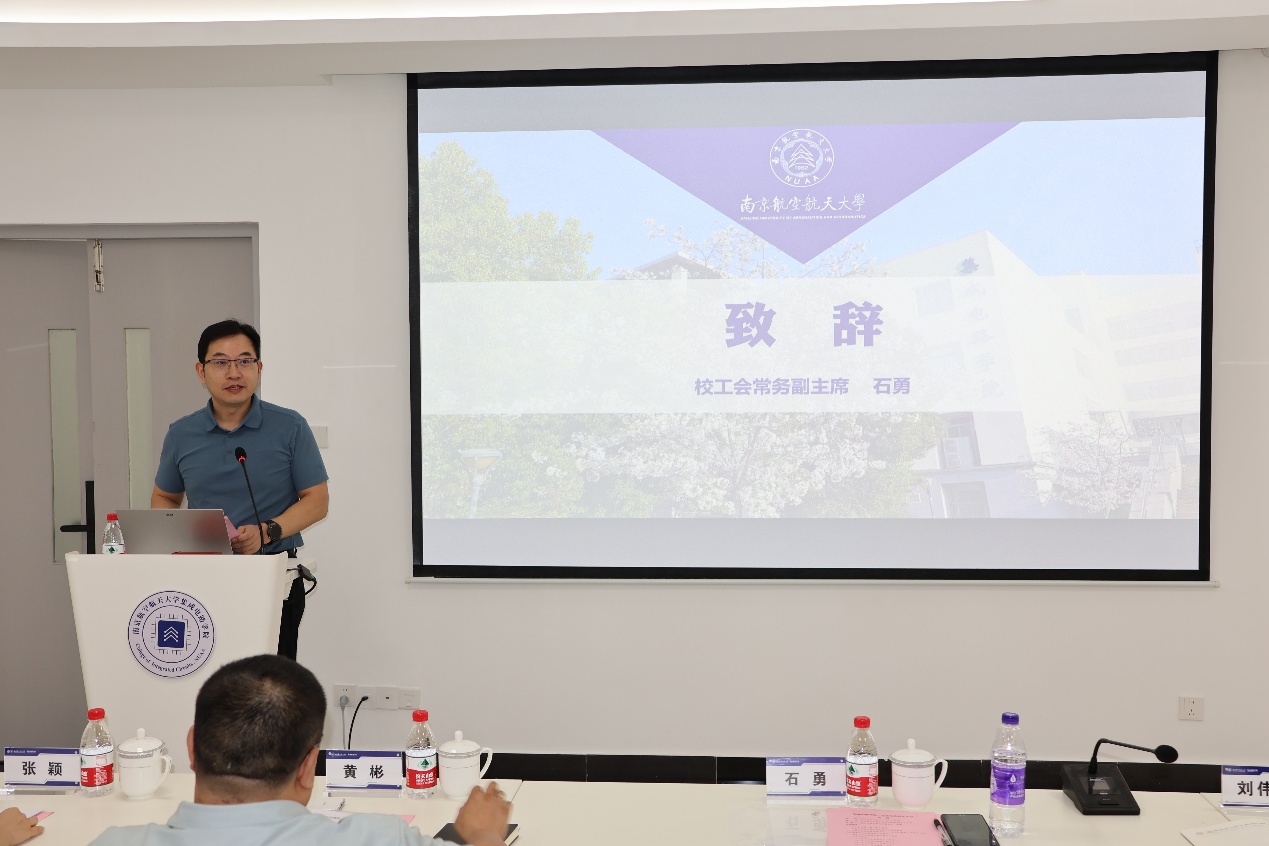 石勇代表校工会对动漫花园 工会成立大会的召开表示热烈祝贺,他指出,学院工会的成立标志着学院的民主管理和服务工作进入了全新阶段,对于更好地团结凝聚教职工、保障教职工合法权益、促进学院高质量发展具有重要意义。他强调,学院工会要提高政治站位,筑牢思想根基,团结带领全体会员自觉将个人发展融入国家航空航天民航伟大事业中;要围绕中心工作,服务发展大局,为学院搭建大平台、产出大成果提供有力支撑;要聚焦主责主业,做实服务保障,切实增强职工的归属感、幸福感和获得感;要加强自身建设,提升履职能力,努力将学院工会建设成为组织健全、制度规范、作用突出、职工信赖的先进组织。